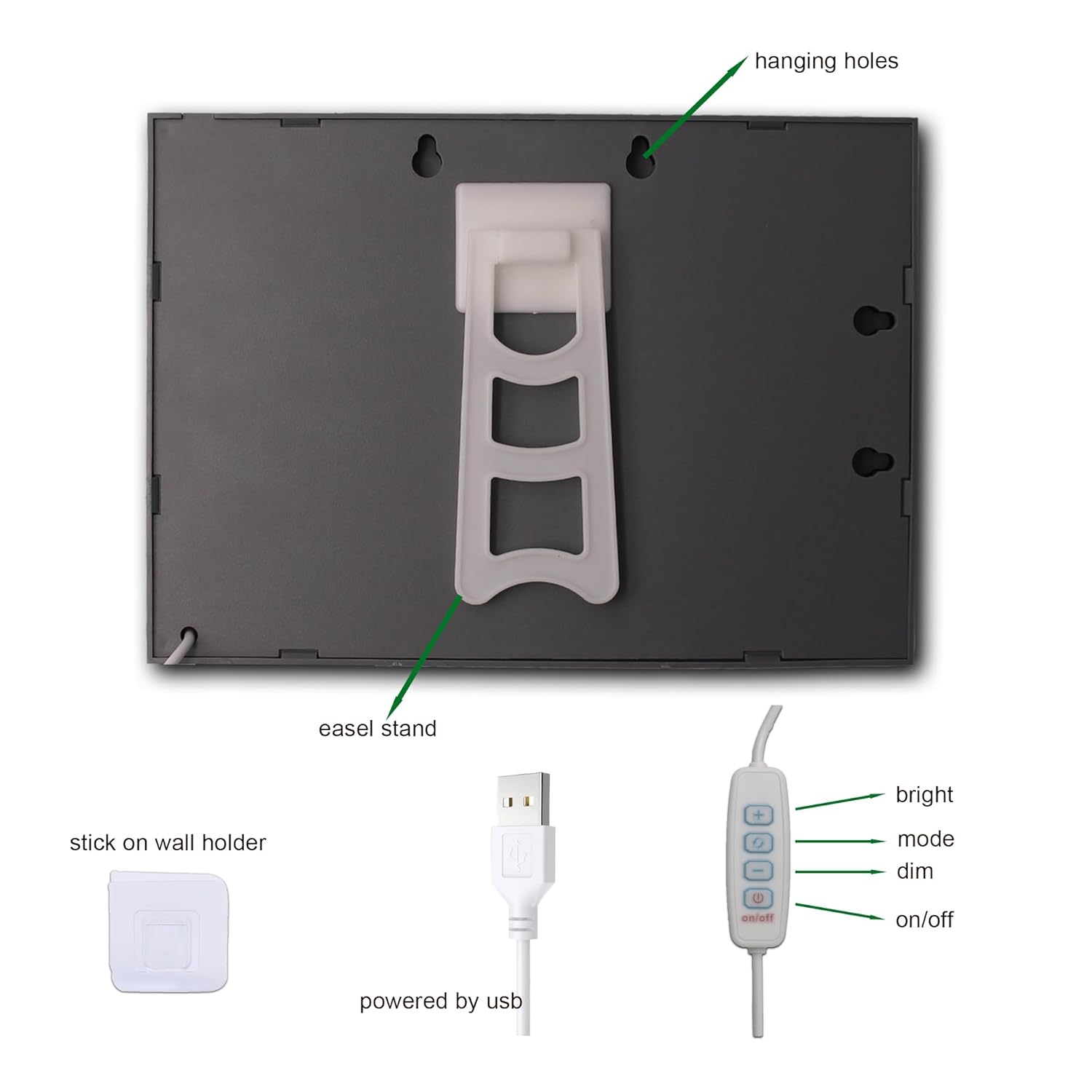 - Installation: Desktop or wall-mounted (hook not included)